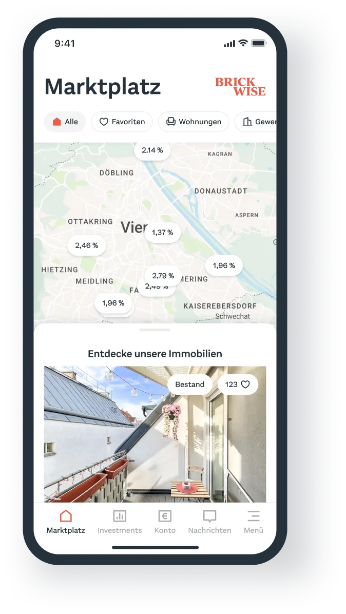 Flaniere durch den Brickwise Marktplatz, entdecke Objekte in deiner Nähe und shoppe Immobilien(anteile) so einfach wie noch nie.
